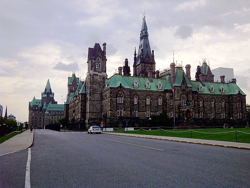 The West Block is one of the three buildings on Parliament Hill, in Ottawa, Ontario. Since 28 January 2019, it has housed the interim House of Commons Chamber, installed to accommodate the House while the Centre Block is closed. The West Block also houses offices for parliamentarians, a branch of the Library of Parliament, committee rooms, and some preserved pre-Confederation spaces.