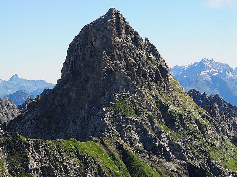 The Zimba, elevation 2,645 m, is the most familiar mountain in the Austrian mountain range called Rätikon. Located in the hinterland of Bludenz, this horn is the landmark of Montafon valley and especially of the main village of Schruns. Three ridges and three walls emphasize the shapeliness of the form. The eastern ridge is one of the most familiar climbing routes of the whole Rätikon range, but the normal way leads along the western ridge. Despite the altitude of just 2,645 m, the Zimba is a great viewpoint for the entire region.