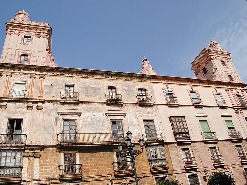 La casa de las Cuatro Torres está situada en el corazón del barrio de San Carlos de la ciudad de Cádiz. Es, en realidad, un conjunto armónico formado por cuatro casas. Juan Clat Fragela, comerciante sirio establecido en la ciudad, fue el promotor de este edificio, levantado entre 1736 y 1745. Consciente de la singularidad de su proyecto, Fragela renunció a parte del solar que poseía para dejar un espacio libre ante la construcción y lograr así una mejor visión del conjunto. Está catalogado como Bien de Interés Cultural.