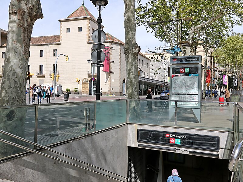 La Rambla | Drassanes es una estación de la línea 3 del Metro de Barcelona situada debajo del Portal de Santa Madrona en el distrito de Ciutat Vella de Barcelona. Está ubicada muy cerca del Puerto de Barcelona, de la estatua de Cristóbal Colón y de las Atarazanas Reales de Barcelona.