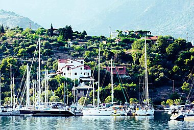 Situé à Trizonia, l'îlot verdoyant du golfe de Corinthe, le Drymna jouit d'une vue panoramique sur un port naturel.