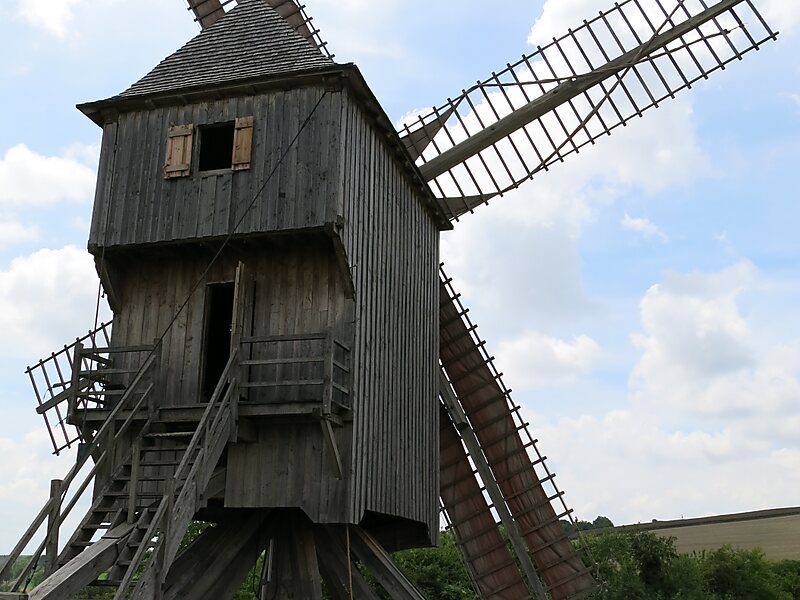 C'est un moulin tout en bois construit sur pivot, c'est-à-dire qu'il faut le faire pivoter pour le mettre face au vent pour une meilleure efficacité. Malgré les 28 tonnes du moulin, il suffit de deux hommes pour pousser le levier et faire tourner le moulin.