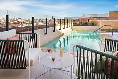 Elegante hotel dotato di terrazza arredata all’ultimo piano con piscina a immersione stagionale, bar e splendida vista su Madrid.