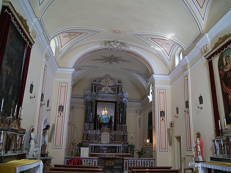 La semplice facciata in pietra lavica intonacata è aperta al centro da un grande portale in pietra lavica, costruito alto in tal modo da poter passare il grandioso fercolo di santa Barbara il 4 dicembre, dato che la processione fa un'importantissima tappa all'interno di questa chiesa un tempo intitolata alla Santa Patrona. L'interno è a pianta rettangolare e coperto con volta a botte.