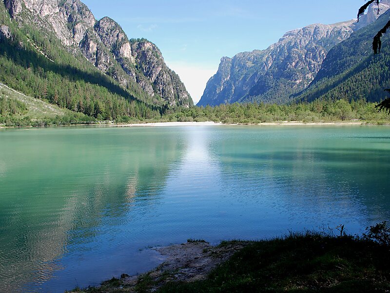 Presso il lago si possono ammirare le ripide pareti rocciose delle Dolomiti, nel territorio del Parco naturale Dolomiti di Sesto.