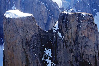 Mount Asgard is a twin peaked mountain with two flat-topped, cylindrical, rock towers, separated by a saddle.