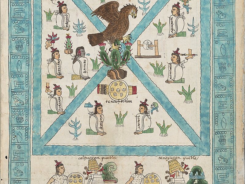 국장 가운데에는 발톱에 뱀을 잡은 채로 선인장 위에 서 있는 황금독수리가 그려져 있는데 이는 독수리가 뱀을 물고 앉아 있는 호숫가의 선인장이 있는 곳에 도읍을 세우라는 아스텍의 테노치티틀란 전설에서 유래된 것이다.