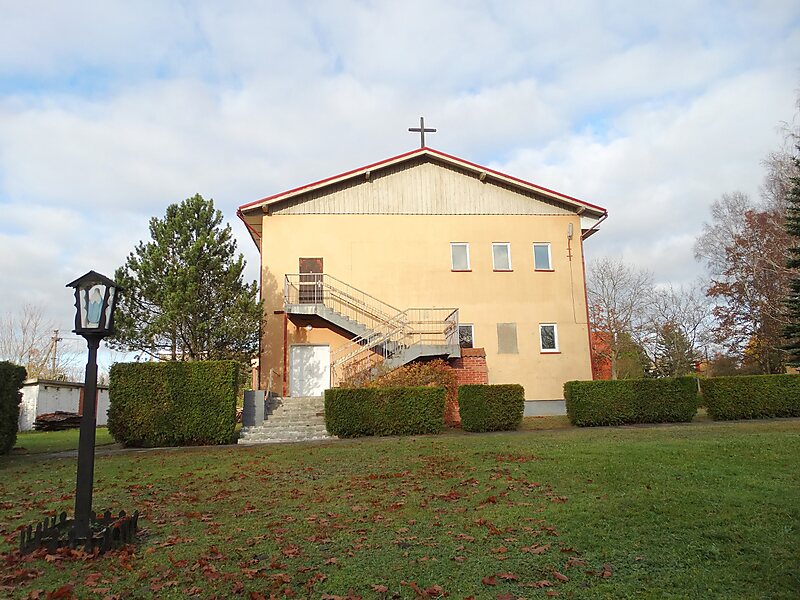 Maldos namai įkurdinti nuo sovietmečio likusiame ir pertvarkytame vaikų darželio pastate. Jame kartu įrengta šarvojimo salė. Šalia pastatyta varpinė. Šventorius yra iš pietų pusės nuo koplyčios, priešais įėjimą, apjuostas metaline tvora ir gyvatvore. Jame taip pat stovi pavėsinė su suolais, stulpinė koplytėlė.