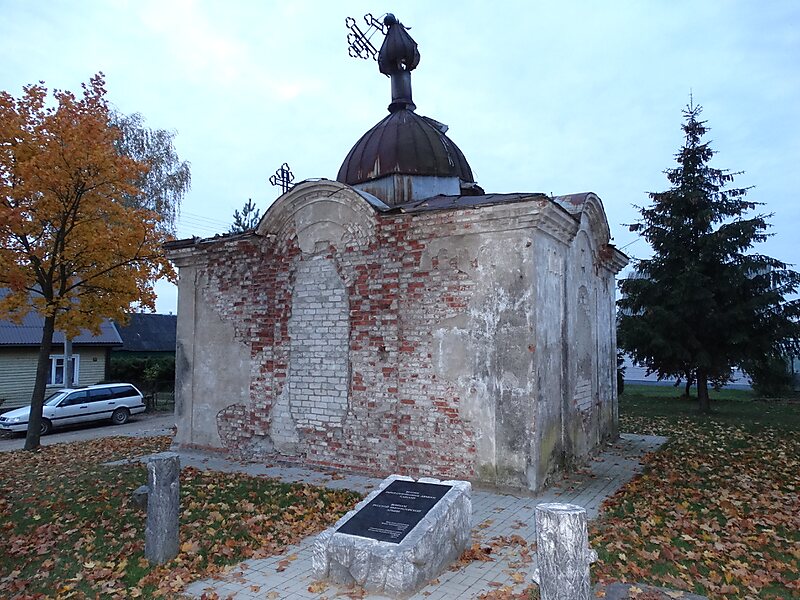 Koplyčia buvo pastatyta tarpukaryje kaip kompensacija už 1930 m. nugriautą Šv. Aleksejaus stačiatikių cerkvę. Pastarosios vietoje iškilo mokykla. 2014 m. duomenimis, koplyčios pastatas stūksojo nesuremontuotas, jį supo sutvarkytų kapinių teritorija. Šalia atidengtas paminklinis akmuo su dvikalbiu įrašu Rusijos imperatoriškosios armijos kariams, žuvusiems Pirmajame pasauliniame kare, atminti.