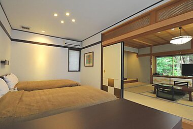 Hotel Sanrakuso beschikt over kamers in Japanse stijl met een prachtig uitzicht op de oceaan.