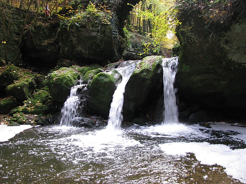 De Zwarte Ernz heeft hier vier geulen ingeschuurd in een drempel van zandsteen. Over de waterval is een stenen brug met een houten leuning gebouwd.