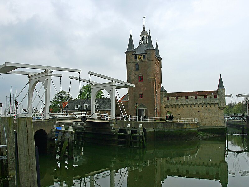 De poort werd in de 15e eeuw gebouwd. Het bakstenen poortgebouw heeft vier hoektorens. Het koepeltorentje is in 1858 vernieuwd. Hierin opgehangen is het oudste carillon van Nederland, uit het oude stadhuis. Bij de poort staat Beproefd maar niet gebroken, het watersnoodmonument van Ad Braat.