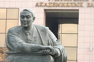The Golden Warrior Monument stands on Republic Square in the former capital of Kazakhstan, Almaty.