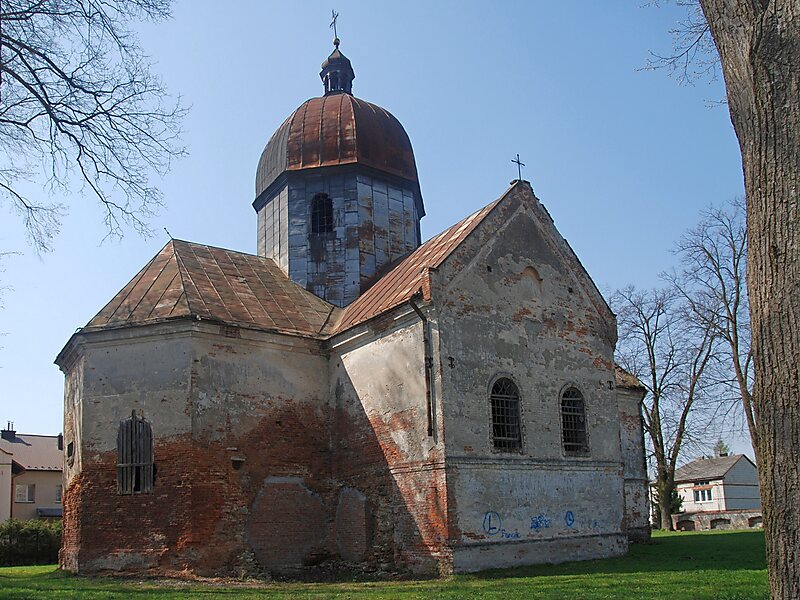 Murowana, zbudowana w 1809 na planie krzyża, z centralną kopułą i wieżyczka na sygnaturkę. Prezbiterium zamknięte trójbocznie, po bokach dwie zakrystie. W 1901 restaurowana i przebudowana. Remontowana w 1936. Po 1947 opuszczona. W latach 50. XX w. służyła jako magazyn. Na początku lat 70. rozebrano murowaną dzwonnicę z wzniesioną w 1846. Obecnie popadła w ruinę.