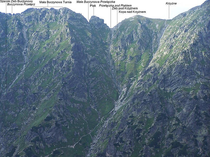 Na północ Ptak opada pionową ścianą do Zadnich Usypów w dolinie Pańszczycy, na południe ścianą, a niżej urwiskiem do Żlebu pod Krzyżnem. Poniżej tej ściany stromymi południowymi stokami Ptaka poprowadzono szlak Orlej Perci.