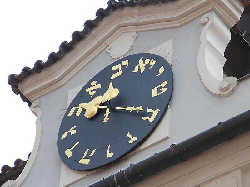 Ratusz, o biało-różowych elewacjach, ma drewnianą wieżę zegarową. Na wieży został umiejscowiony, obok czterech klasycznych zegarów z rzymskimi cyframi, oryginalny zegar z cyframi hebrajskimi, którego wskazówki poruszają się w kierunku przeciwnym do ruchu wskazówek zegara. Wieża została zbudowana za pozwoleniem cesarza Leopolda II, w dowód wdzięczności za udział Żydów w obronie praskich posiadłości przed Szwedami.