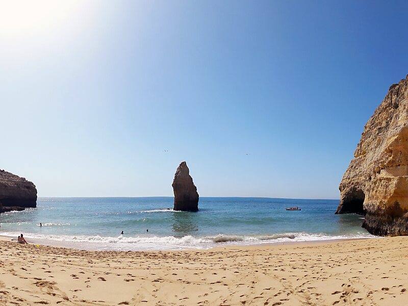 Conhecida por ser uma praia tranquila de areias ricas em conchas e águas límpidas e frias, esta praia ofereça aos seus visitantes uma fresca sombra na parte da manhã e da tarde, devido às suas altas rochas dispostas quer do lado poente, quer no lado nascente. Possui umas escadas esculpidas na rocha por onde se pode subir até meio da falésia, a cerca de 6 metros de altura, e mergulhar na água.