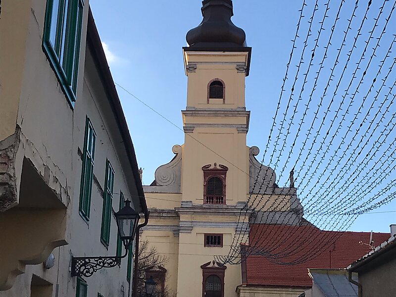 Stavať sa začal v roku 1632 na mieste staršej gotickej stavby. Konečnú podobu získal v roku 1712. Mesto dalo pristaviť druhú polovicu uličného krídla v roku 1749. Kostol má dĺžku 54,4 m, šírka hlavnej lode je 16,9 m a výška 16,8 m. Maximálna šírka svätyne je 11,4 m a jej výška je 15,3 m.