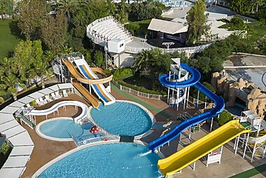 Deniz kıyısında yer alan Megasaray Club Belek'da 5 adet açık yüzme havuzu, 3 su kaydırağı ve spa olanakları; özel kumsalında ise iskele…