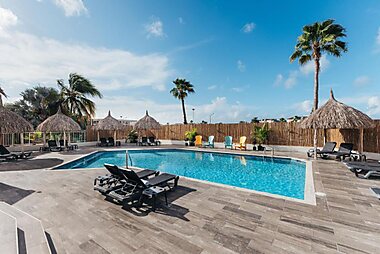 Bon Bini Sea Side Resort假日公园距离Mambo Beach海滩有5分钟步行路程,提供室外游泳池、阳光露台、花园、覆盖各处的免费WiFi以及全景空调简易别墅。