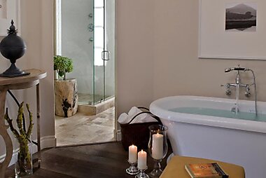 This five-star California hotel features spacious suites with private balconies, fireplaces and sofas.