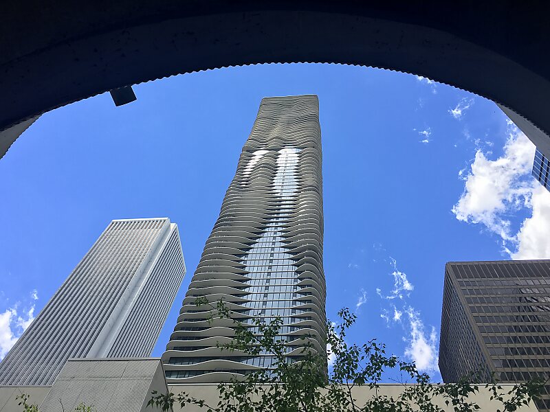 Aqua是一栋位于美国芝加哥洛普区的住宅办公混用摩天大楼,共82层,以及地下1层为停车场。大厦1楼到8楼建筑面积为13,000平方米 ,8楼露台面积7,669平方米 ,露台设有花园、观景亭、游泳池、热水浴池、步道、以及观景火坑。8楼以上的建筑面积每一层大约是1,500平方米 。Aqua大厦在2009年安波利斯摩天大楼奖获得第一名 ,并在2010年入围国际高层建筑大奖。