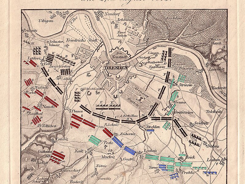 德累斯顿战役发生于1813年8月26日-8月27日于德国德累斯顿附近。结果在拿破仑带领下,法国击败第六次反法同盟的普俄奥联军。然而拿破仑却没有赢的彻底,造成日后战斗的艰辛;几天后,侧翼军团被围被迫投降后,双方又发生了库尔姆战役。