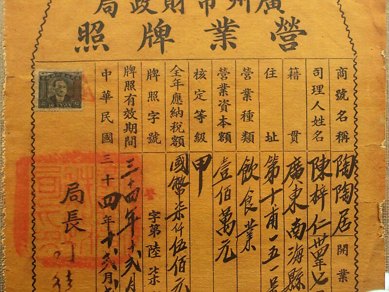 廣州市財政局營業牌照。中華民國三十四年十二月二十…