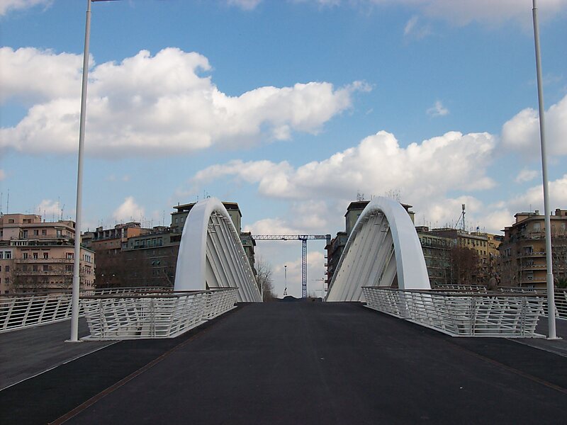 音乐-阿曼多·特罗瓦霍利之桥 是罗马的一座钢筋混凝土拱桥,长190米,宽22米,建于2008-2011年,连接了台伯河两岸的德拉维多利亚区与弗拉米尼奥区;连接了弗拉米尼奥河岸与卡多纳元帅河岸;连接了音乐公园礼堂、格洛里别墅公园、国立二十一世纪艺术博物馆、奥林匹克剧院、意大利运动区 、马里奥山绿地、意大利广播电视公司礼堂等。